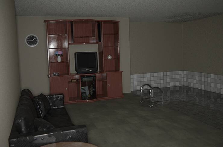 De vloer helt licht naar het zwembad zodat je ook niet meer van de bank hoeft op te staan wanneer je moet plassen.