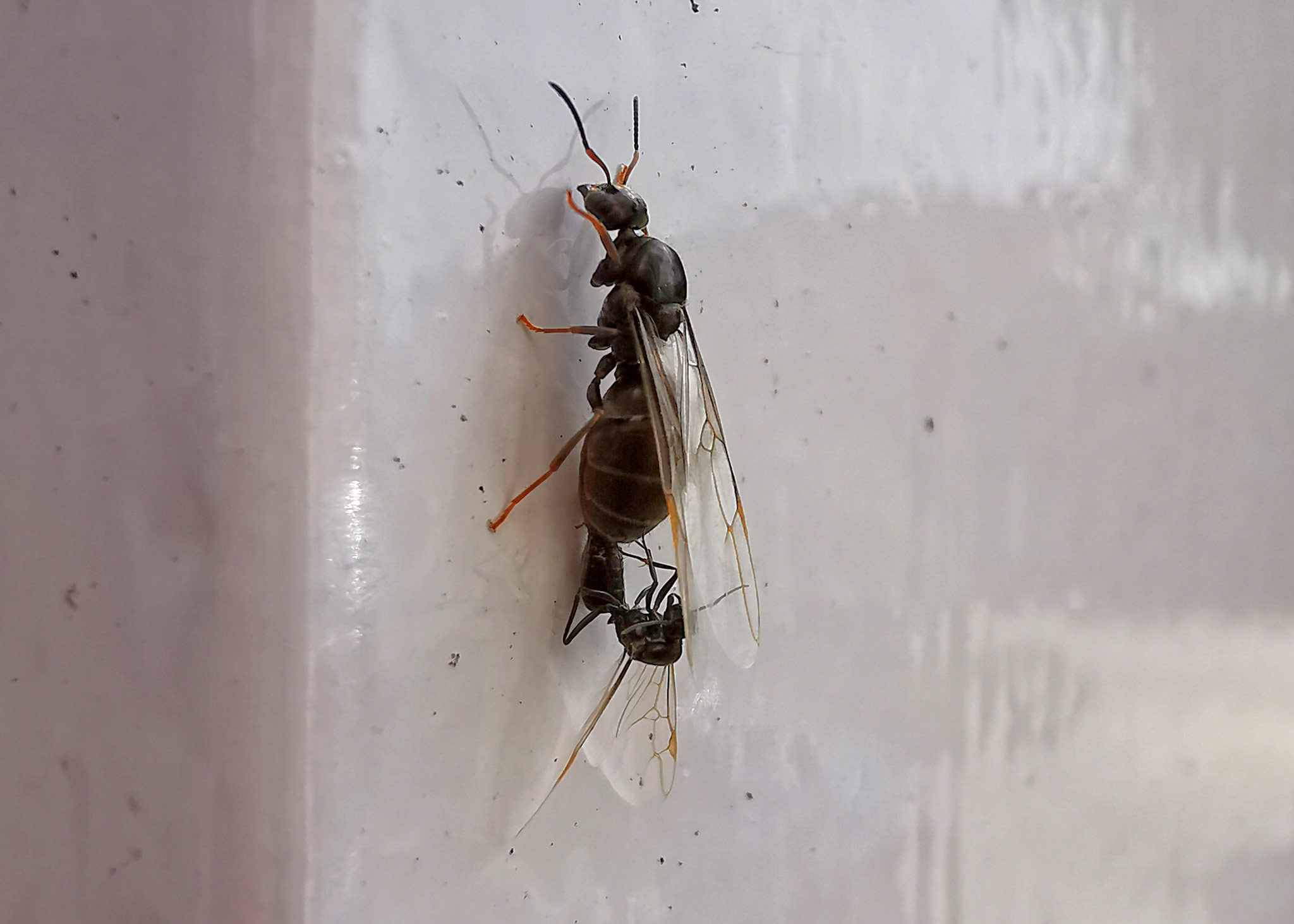 Het was een jonge koninginnenmier die net haar bruidsvlucht had gedaan en de laatste lucky bastard nog als een trofee achter haar aan sleepte.