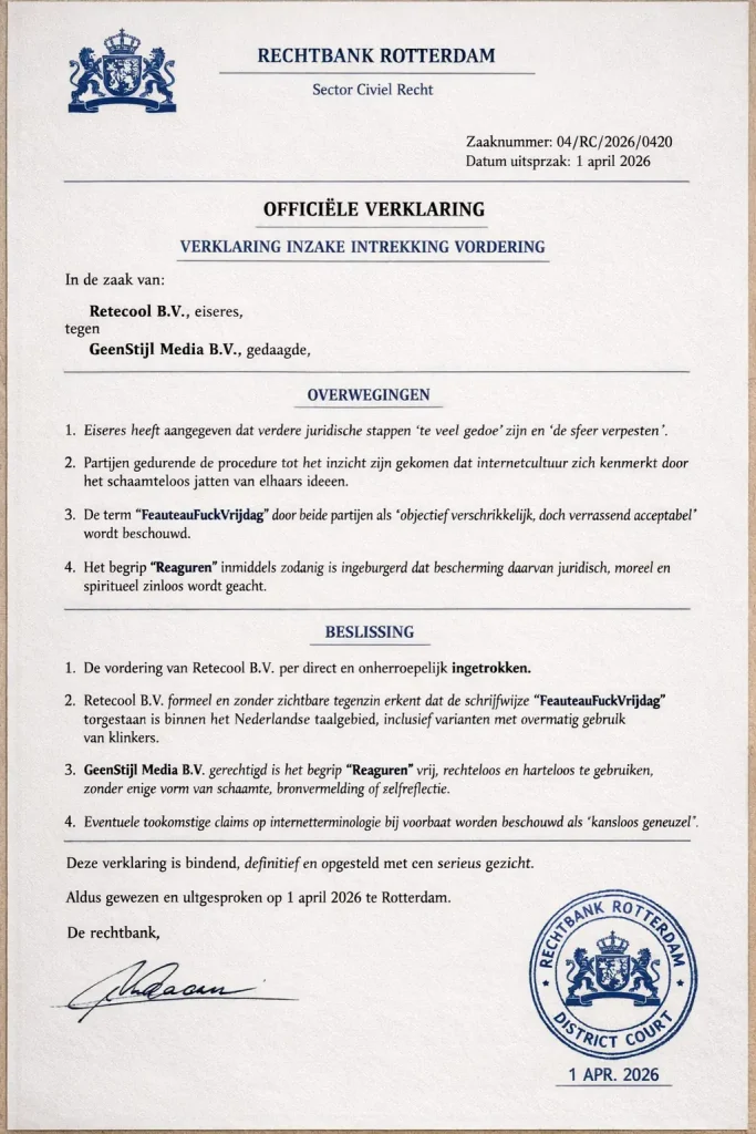 2. Retecool B.V. formeel en zonder zichtbare tegenzin erkent dat de schrijfwijze “FeauteauFuckVrijdag” toegestaan is binnen het Nederlandse taalgebied, inclusief varianten met overmatig gebruik van klinkers.
