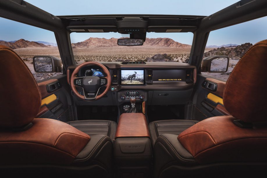 Maar daar houdt de vergelijking niet op. Ook qua vormgeving zijn ze dicht bij het origineel gebleven. Dus de Bronco is lekker hoekig, met zowel aan de voor- als de achterkant weinig overhang, dus perfect voor in het terrein. Deze trend hebben ze voortgezet in het interieur, want hoewel modern vormgegeven, heeft het dashboard toch een tijd jaren 70 gevoel.