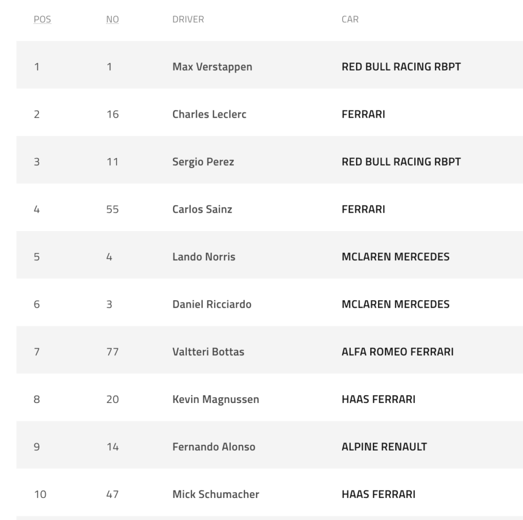 Opmerkelijk de verschillen tussen de teammaten qua tijden en posities (BOT-ZHO, TSU-GAS, NOR-RIC, MAG-MSC) los van spins.