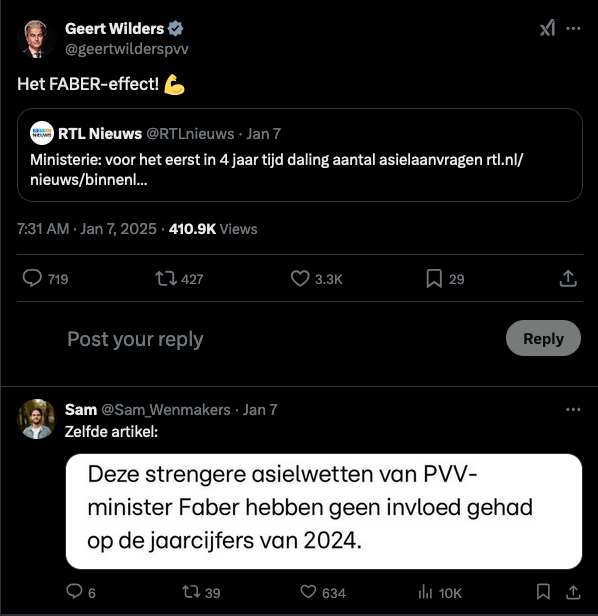 Vandaag bleek dat het aantal asielaanvragen gedaald is in 2024, alleen had dat niets met haar aanstormfrontende wetten te maken, al blijkt Geert dat nog niet door te hebben: