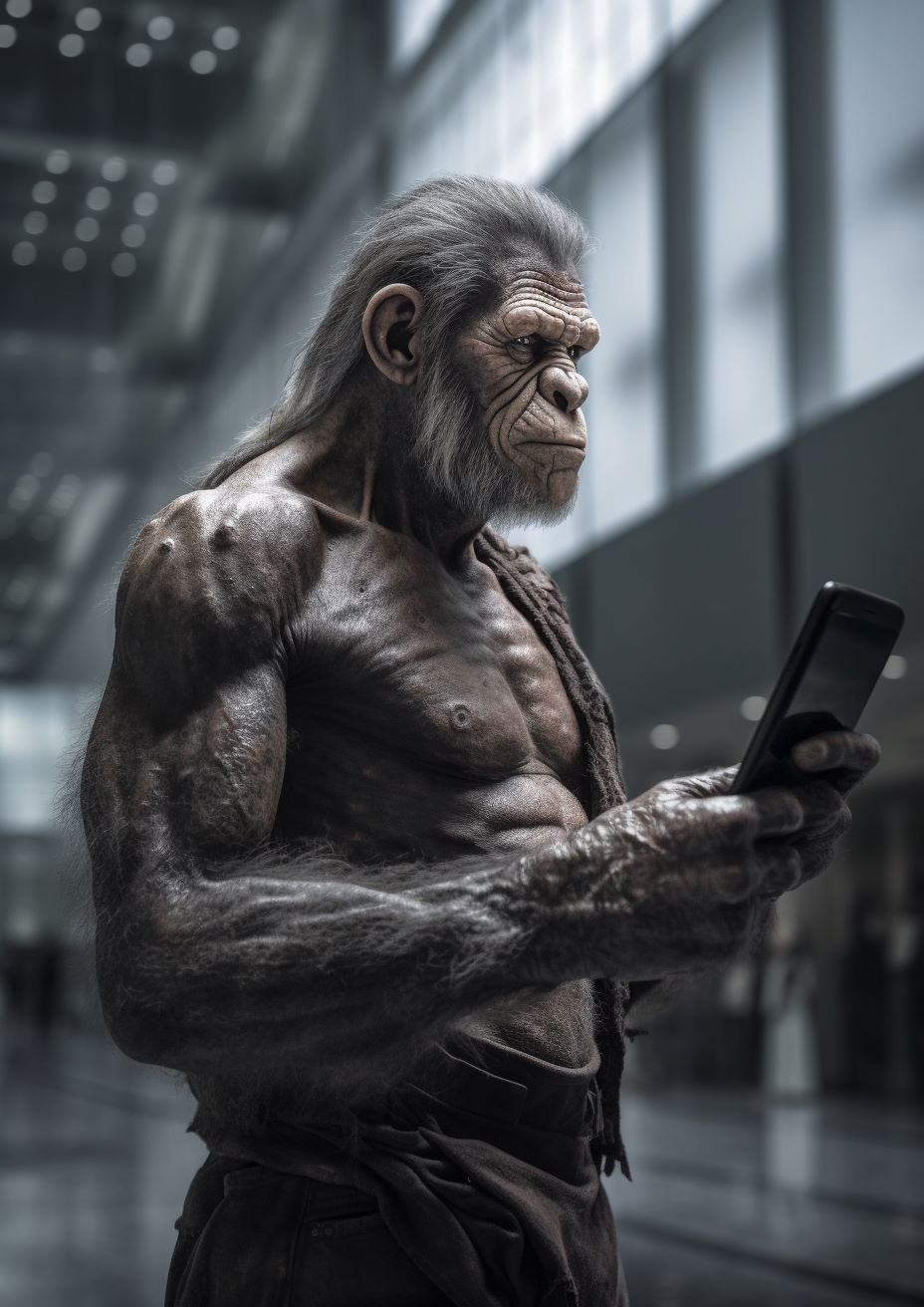 photo portrait in style of Peter Lindbergh, dumb looking Neanderthal using big touch screen, empty floor of a modern building –ar 5:7