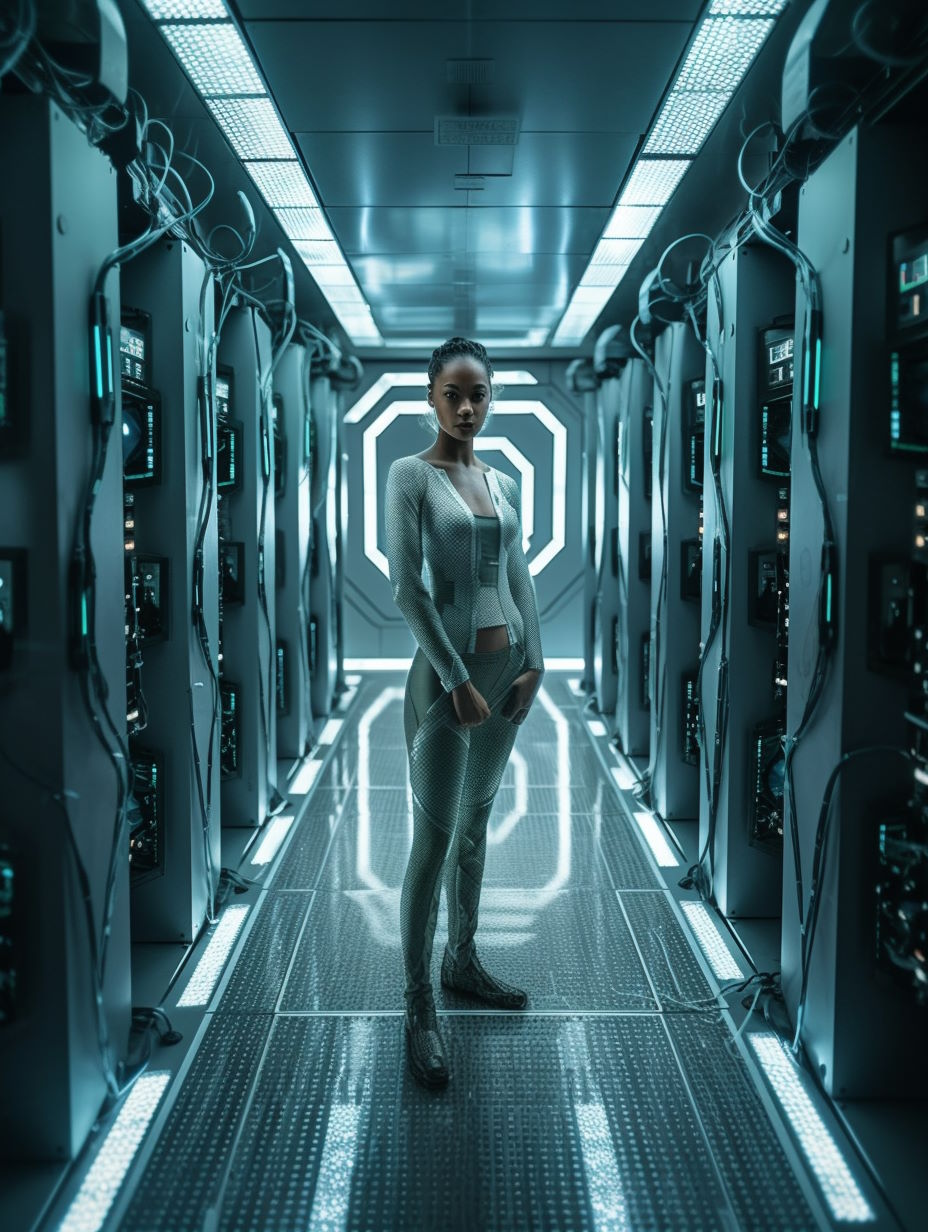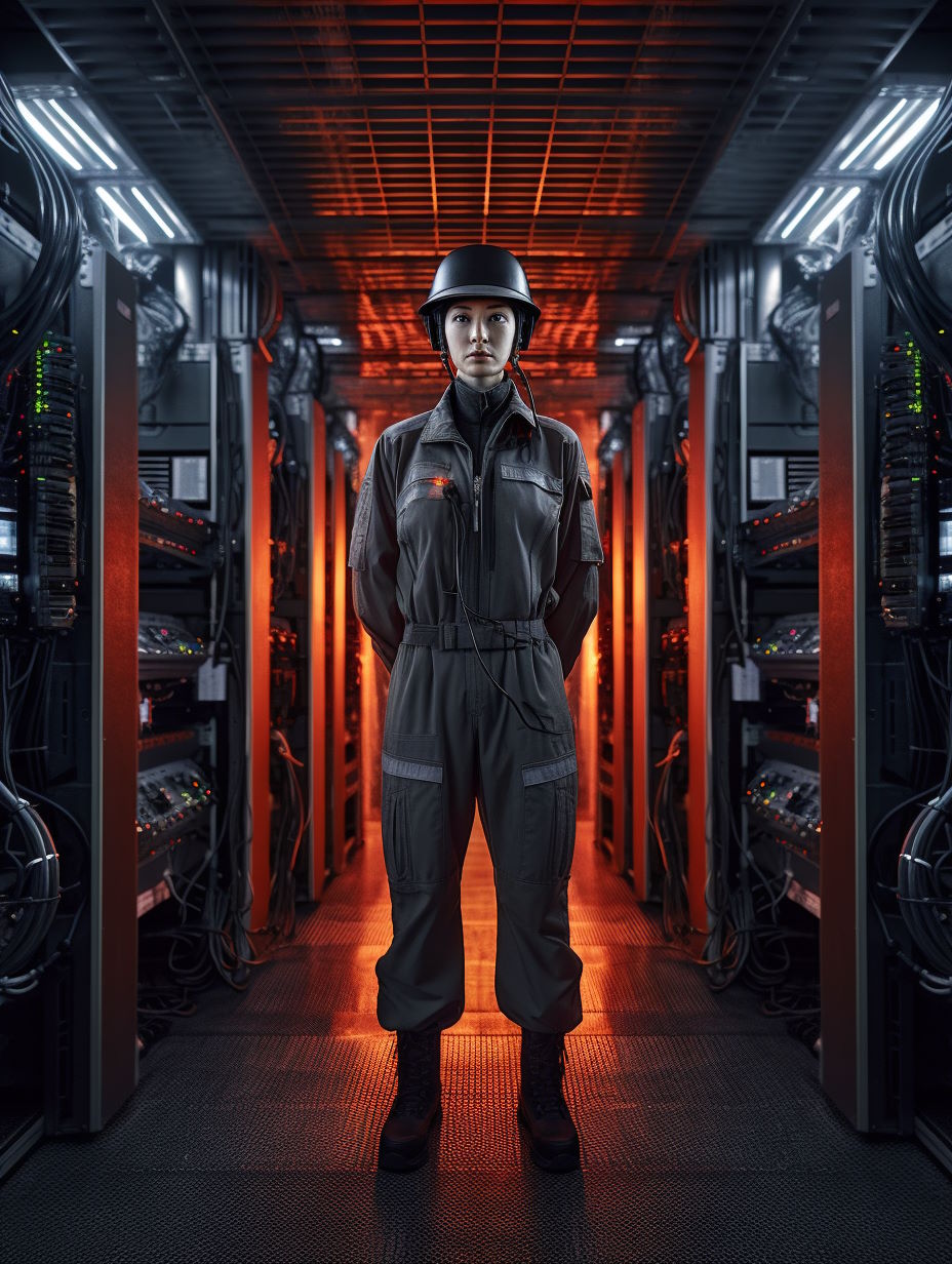 press photo of a cleaner in a computer server room, full body, future tech, sci fi, dystopian, detailed face, detailed arms, full body portrait, photograph, exquisite detail –ar 3:4