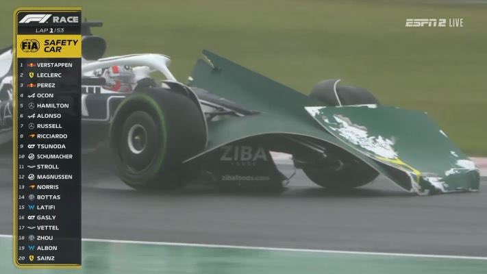 Hoe is het afgelopen met dat stukje diffuser dat VER gisteren losliet op de kerbs? Mogen ze dat onder parc fermé toch weer vastplakken?