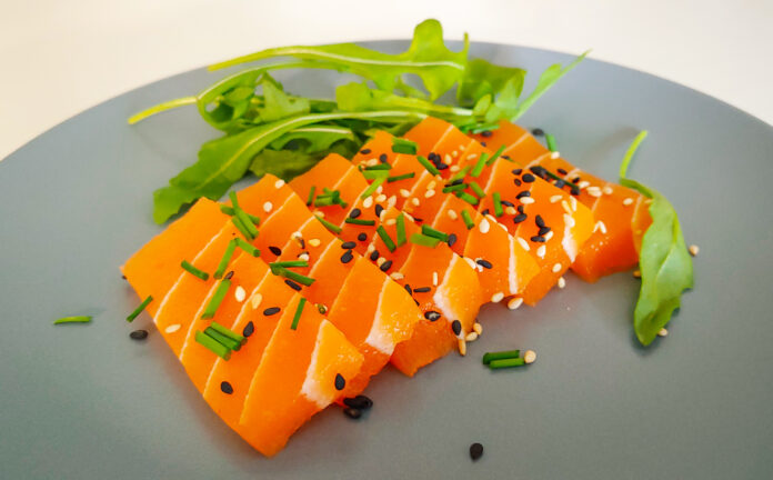 Het was dus met gigantische achterdocht dat we een pakje zalm van Vegan Seastar lieten ontdooien, overigens hetzelfde bedrijf achter de Vega Kalamariz die we onlangs hier bespraken. Net als bij de Kalamariz vinden we ook bij de zalm teleurstellend weinig gebruiksaanwijzing, en al helemaal geen inspirerende recepten om toe te passen. “Laten ontdooien en dan gebruiken in sushi of sashimi of zo. Kijk maar”. Meer aanknopingspunten hebben we niet. Eigenwijs als we zijn hebben we toch een plakje heel kort zachtjes gebakken in wat olijfolie en daardoor werd duidelijk waarom dat je dit product niet moet verwarmen: al smeltend veranderde het in een roze plasje.