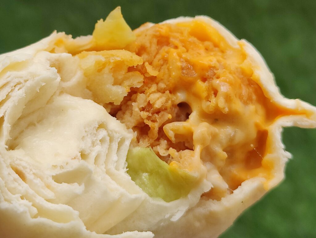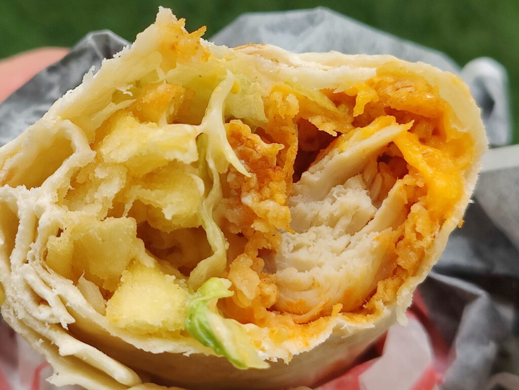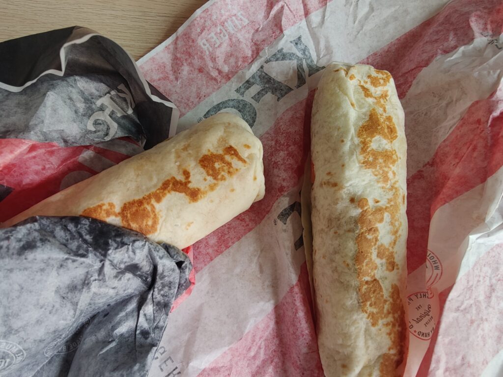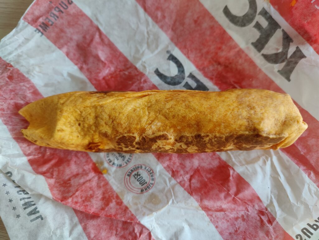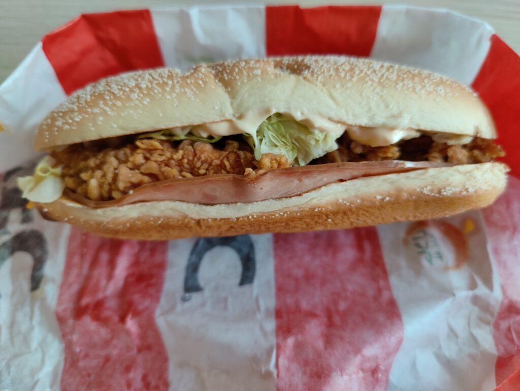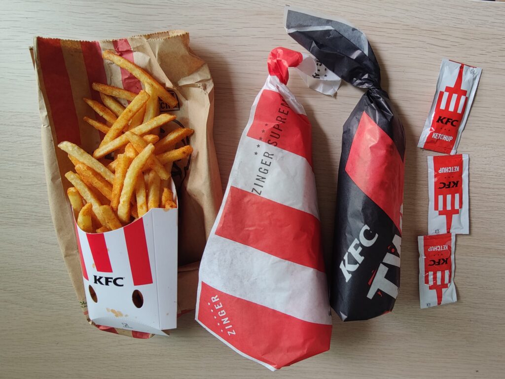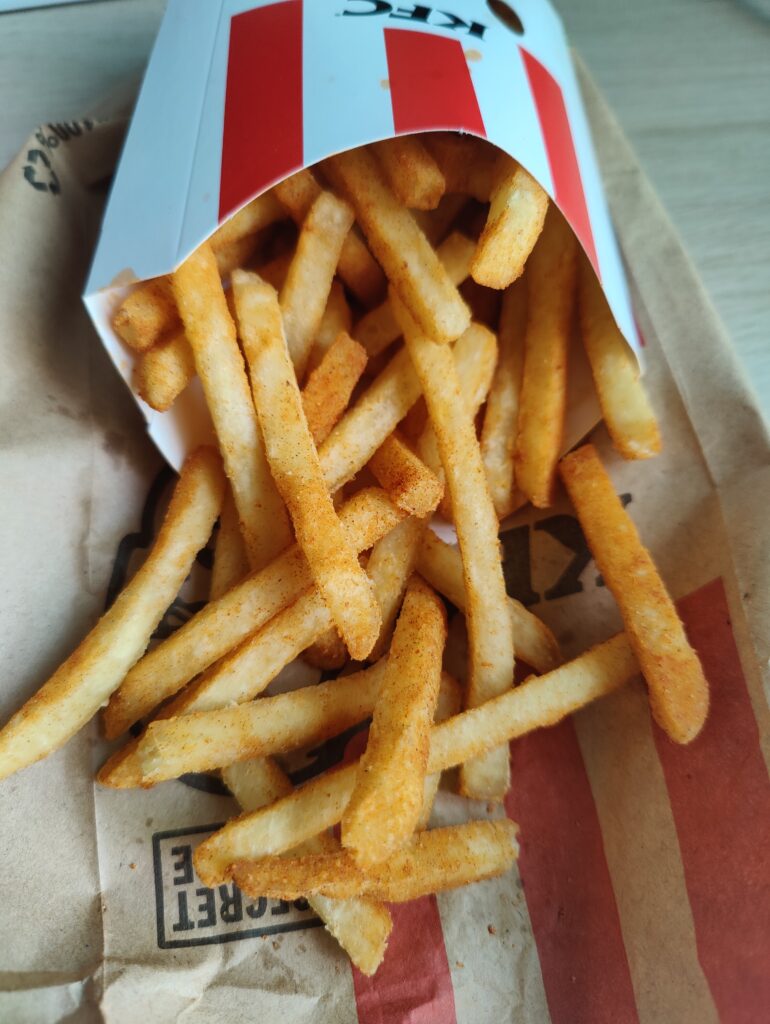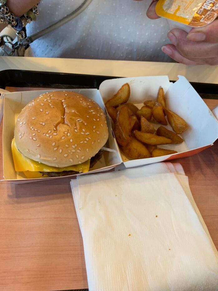 Het eten is ook een kopie. Het is goedkoper, maar de kwaliteit is ook minder. Zo is de cheeseburger veel te klein, de Big Special niet zo big, de โgrandโ hamburger (wij zeggen gamboerger) niet zo grand maar vooral droog en smakeloos. De frietjes zijn vervangen door aardappelstukjes, prima lekker, het kersengebakje (die โloempiaโ op de foto) is ook vrij klein. De milkshake-automaten waren niet stuk. De vanille- en aardbeienshakes waren net als toen, zij mogelijk nog de oude mix van de Mc?
