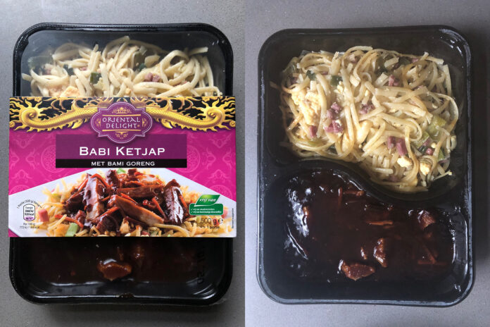 De verpakking ziet er prima uit: aan de voorkant bevindt zich een doorkijkvel, waardoor je zowel de Babi Ketjap als de Bami Goreng prima ziet zitten. Er om heen zit een wrapper van karton met generiek Oosters motief en een foto van de bereidde maaltijd. Kijken of we dat straks na kunnen maken. Op de achterkant staan uiteraard de ingrediënten, de manier van bereiden en de voedingswaarden. Wat direct opvalt is dat er een gigantische berg zout in zit: 133% van de aanbevolen dagelijkse hoeveelheid. Nu heeft Babi Ketjap van origine ook al vrij veel zout (en veel suiker), maar voor één portie 8 gram zout is echt wel wat gortig. Gelukkig staan er ook op de verpakking dat het om “restaurantkwaliteit” gaat, dus dan komt het goed. Wat dat inhoudt, lezen we iets verder op de verpakking: “Bereid zoals in Aziatische restaurants: volgens traditionele receptuur en op hoog vuur gewokt“. Ah, dat is dus restaurantkwaliteit. Maar dat zegt eigenlijk nog steeds helemaal niets.