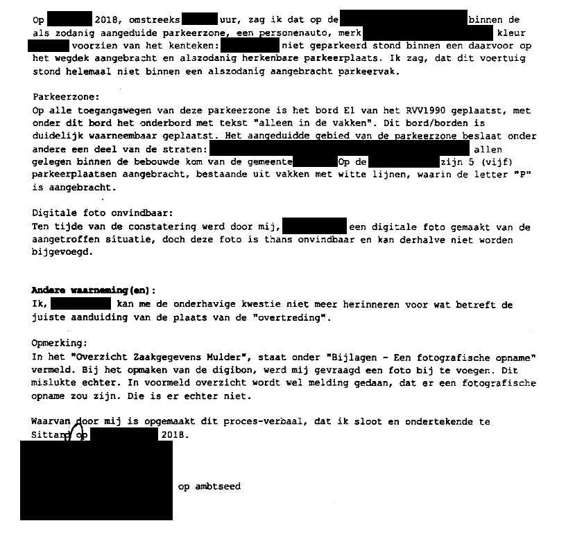 Gaan we er even rustig doorheen. De verbalisant heeft een auto buiten de vakken zien staan. De straat waar het gebeurd zou zijn is 700 meter lang en heeft drie zijstraten. En zeker meer dan vijf parkeerplaatsen. Het maakt dus nogal uit waar het voertuig zou hebben gestaan, maar de verbalisant geeft direct al aan geen herinnering te hebben van waar het voertuig precies stond. Maar wel buiten één van de vijf vakken.