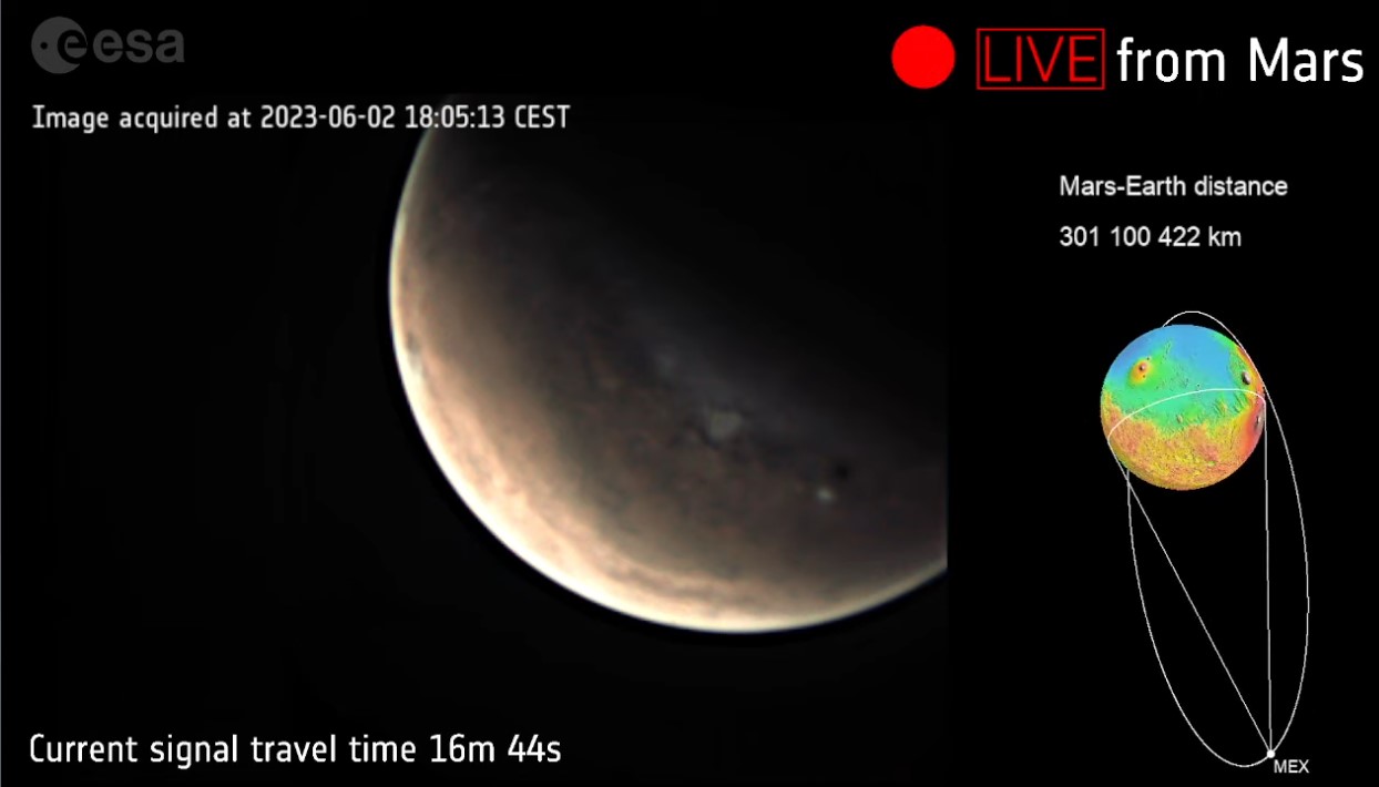 Stem af op onderstaande stream en wees een van de eersten die elke 50 seconden nieuwe foto’s te zien krijgt, rechtstreeks uitgezonden door de Visual Monitoring Camera aan boord van ESA’s Marsorbiter.