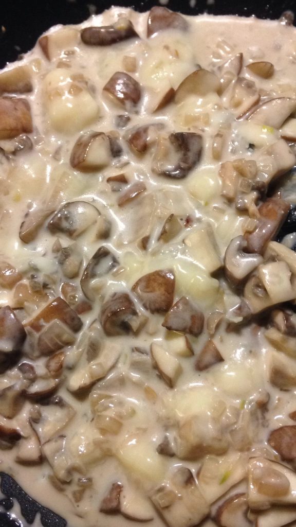Snijd alles wat paddenstoel is met het grootste mes dat je hebt in blokjes. Zolang het uiteindelijk nog maar op een lepel past. Snijd ook de gorgonzola in blokjes. Oh, wacht, dat kan helemaal niet, omdat het plakt als een gek. Hm. Laat dan maar zitten. Ga dan eerst maar even wat hout hakken! Snijd, zodra je genoeg hout gehakt hebt, de peterselie en de ui klein.