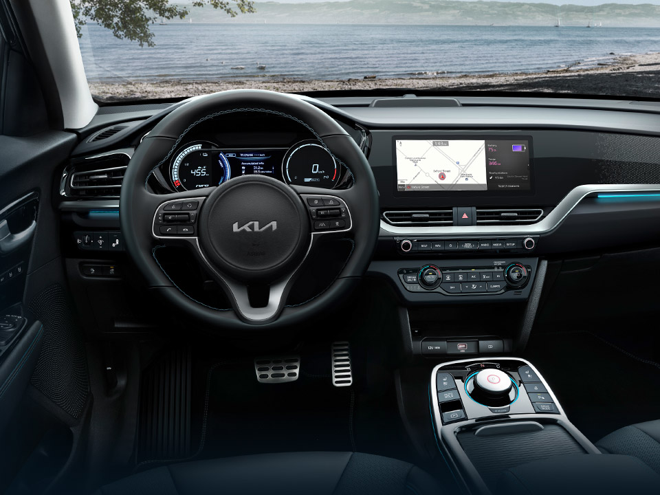 Maar vandaag dus de e-Niro, de elektrieke uitvoering van de bekende evenknie die nog hongert naar dinosap. Aan de buitenkant valt op dat de auto forser is dan verwacht, niet dat de instap op boomerhoogte is, maar de auto is wel ruim van binnen, voor en achter en ook voor de 2-wekelijkse rit met bierkisten. Verder vallen dichte grille (met laadklep), de blauwe accenten en het gebrek aan knalpot op.