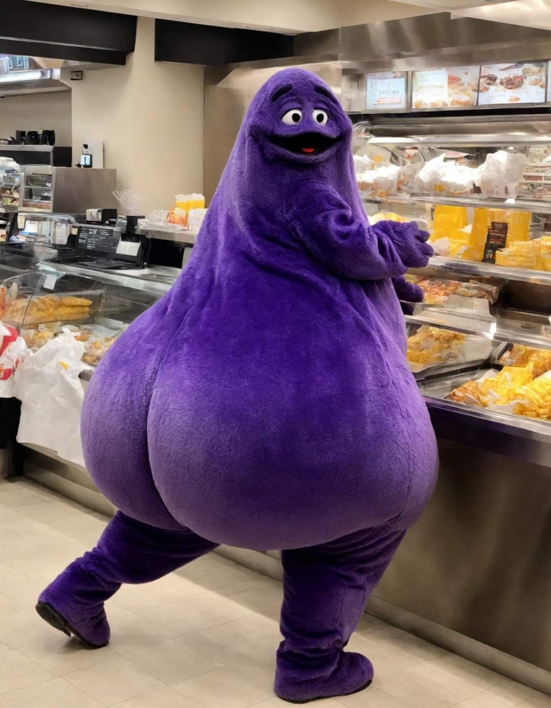 Badonkadonk, de nieuwe inwoner van Sesamstraat, betrapt in de kantine.