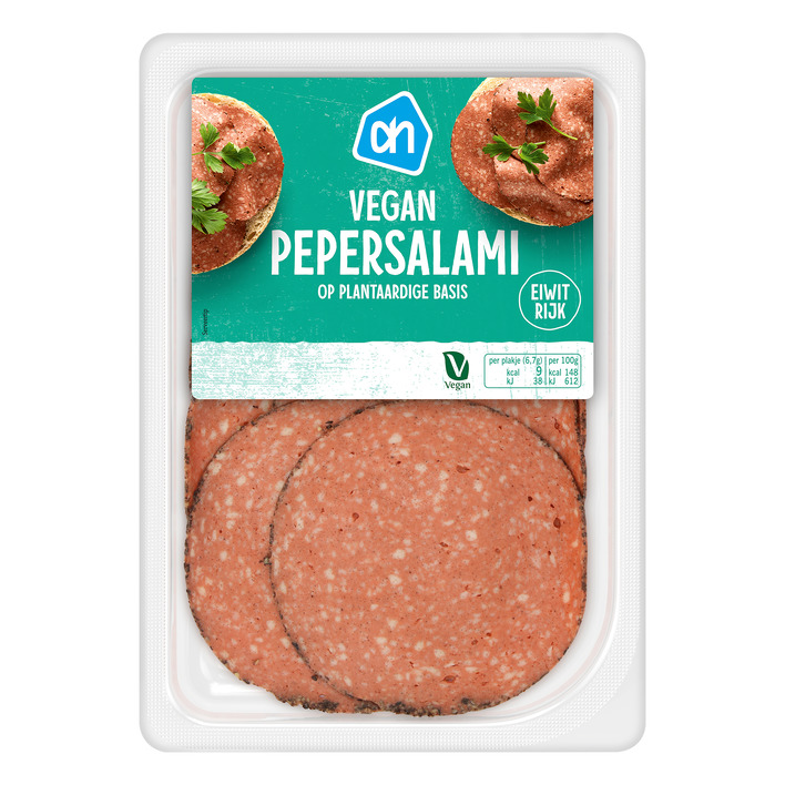 Onze Grote Mensenvriend Albert Heijn heeft onlangs een setje vegan vleeswaren “voor op de boterham” gelanceerd. Eerder dit jaar had AH al de vlees/visvervanger afdeling van een flinke uitbreiding voorzien, en de hier besproken AH Vegan Kibbeling bleek een enorme deceptie. Kortom: met niet al te hoge verwachtingen kochten wij de Pepersalami, want wij houden wel van een beetje pit op ons brood.