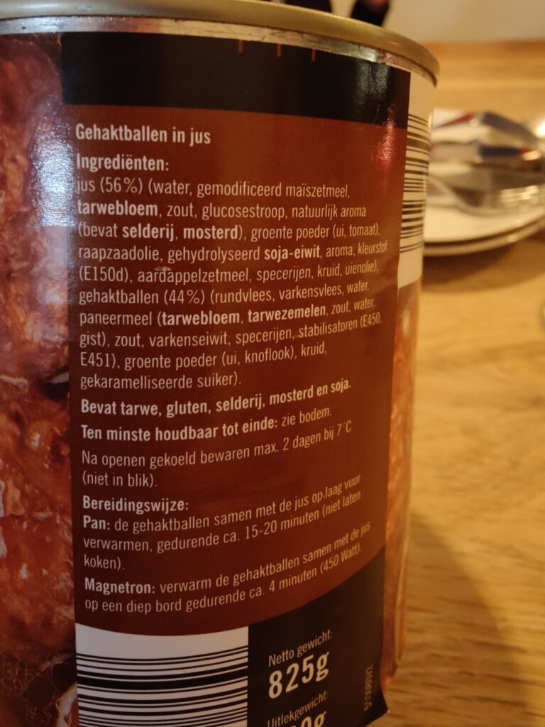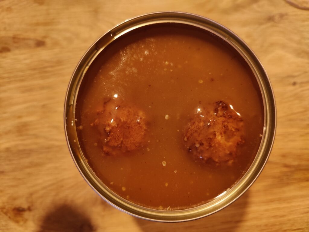 Structuur is matig. Beetje los zand. De claim van de “stevige ballen” kan dan ook de prullenbak in. Heerlijke jus, zult u vragen, nou dat zat dan net niet in ons blik, want je kunt deze jus veel verwijten maken, maar niet dat die heerlijk is. Het is teleurstellend, je zal toch 4.99 betaald hebben voor deze prut en dan hoopvolle blikken op de smoeltjes van je klindjes zien versmelten na de eerste hap.