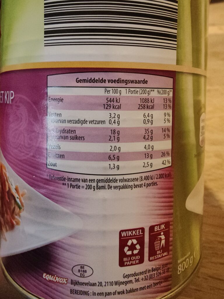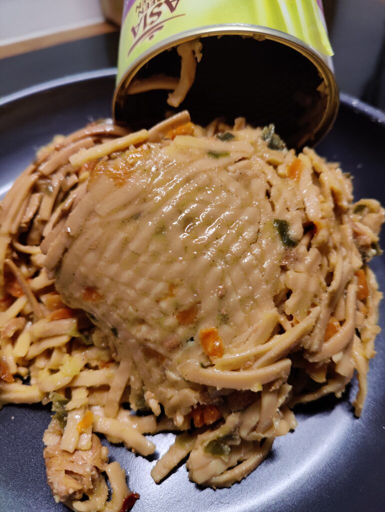 Het meest positieve is dat het veel is. Althans, best veel bagger, want groot blik. Is het lekker? Nee. Matige zompige bami, de kip heeft weinig tot geen textuur, groente (wat toch 26% zou moeten zijn) heb je weinig plezier van en lijkt vooral afwezig en het is vooral zout. En ja, dat kun je een reet pullen en het compleet onderkwarken met sriracha, maar dan is zo ongeveer alles lekker te maken.
