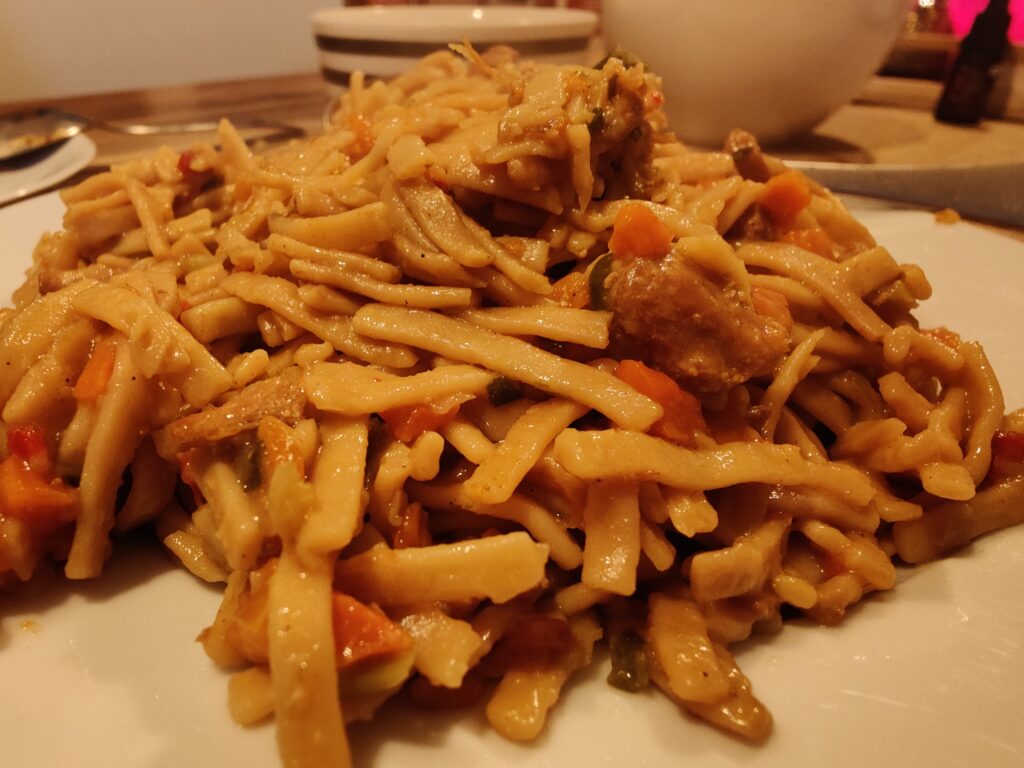 Heeft u ook trek? Dat treft. We troffen een blik bami goreng van de Aldi in de Vretecoolkast aan dus wij meteen augurk gepakt (haha, nee) een pan op de kookplaat, blik opentjoppen en omkieperen maar.