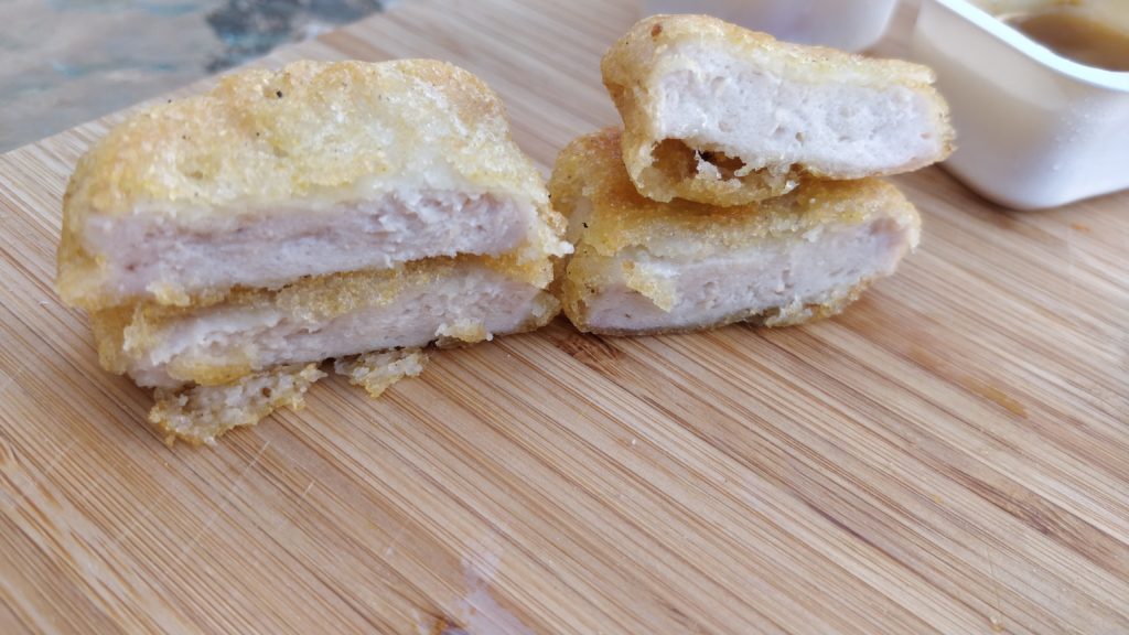 “Serveersuggestie”. De nuggets zien er een beetje uit zoals een stel jongeren uit Purmerend na 3 dagen Salou. Wit van binnen en ietwat verkleurd op random plekken.