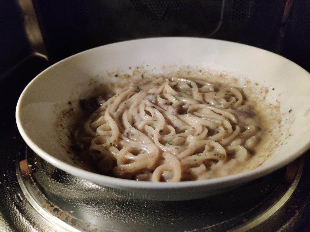 Ondertussen zei de magnetron ping, dus gekeken hoe die noodles inmiddels waren. Van mooi sterrentoetje naar de autopsiefoto van JFK in minder dan 14 minuten.