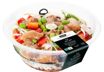 Wat is het? Een plastic bakje ter grootte van een lunchbord, maar dan met 2 etages. Beneden woont een kudde rijst in een laag ketjap, in de bovenste etage huizen brokken kip samen met een assorti oriëntaalse wokgroenten.