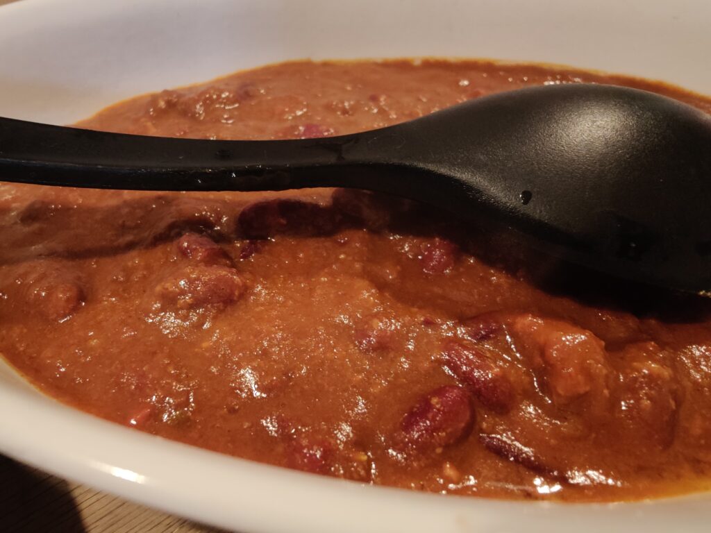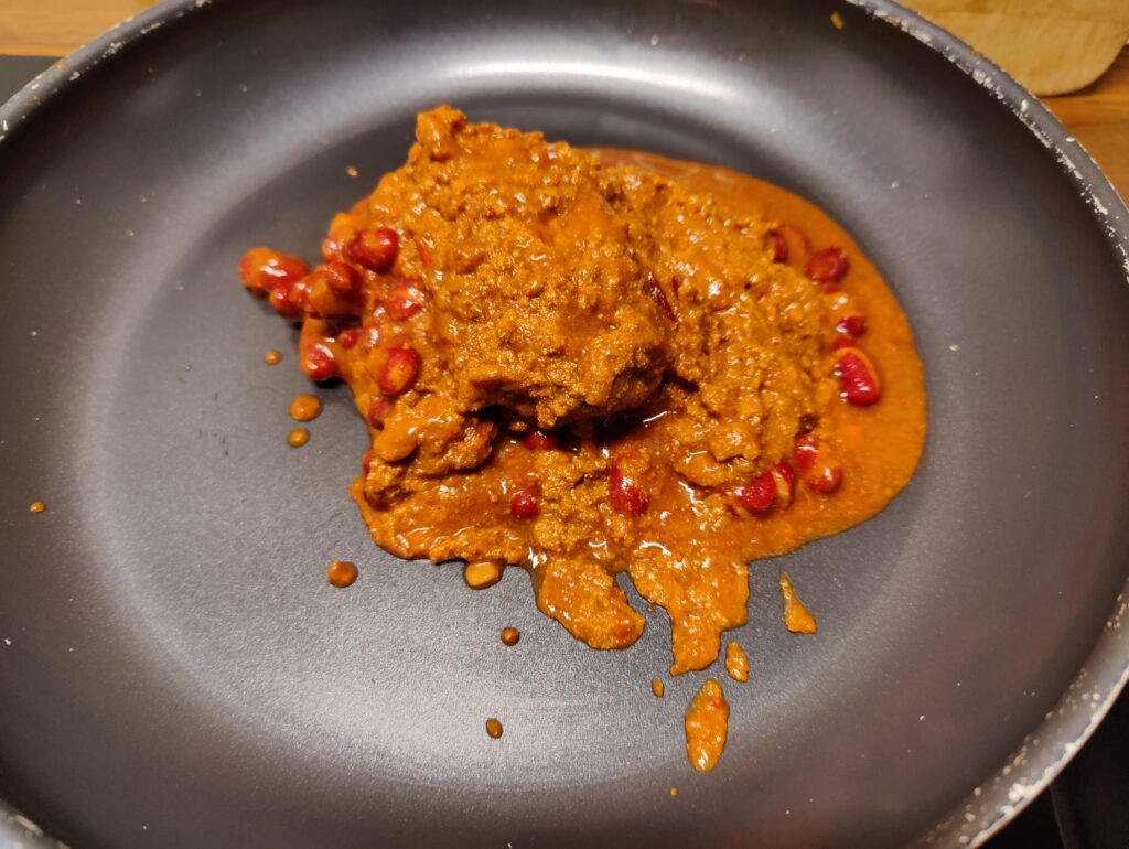 De bonen zijn wat zompig maar de chili is smaaktechnisch eigenlijk heel ok.