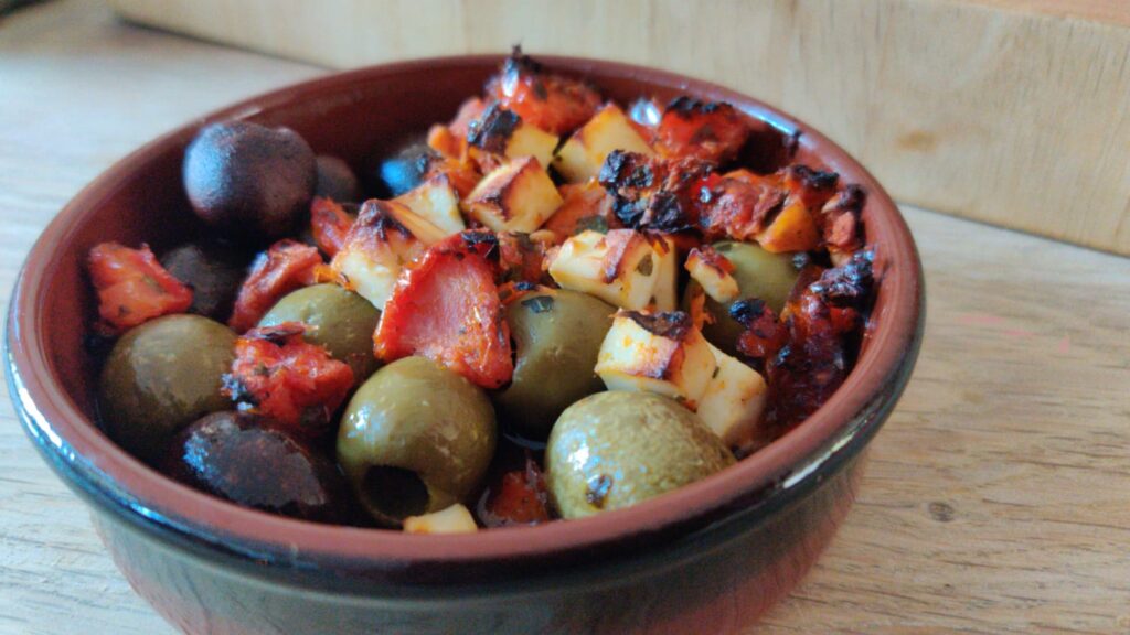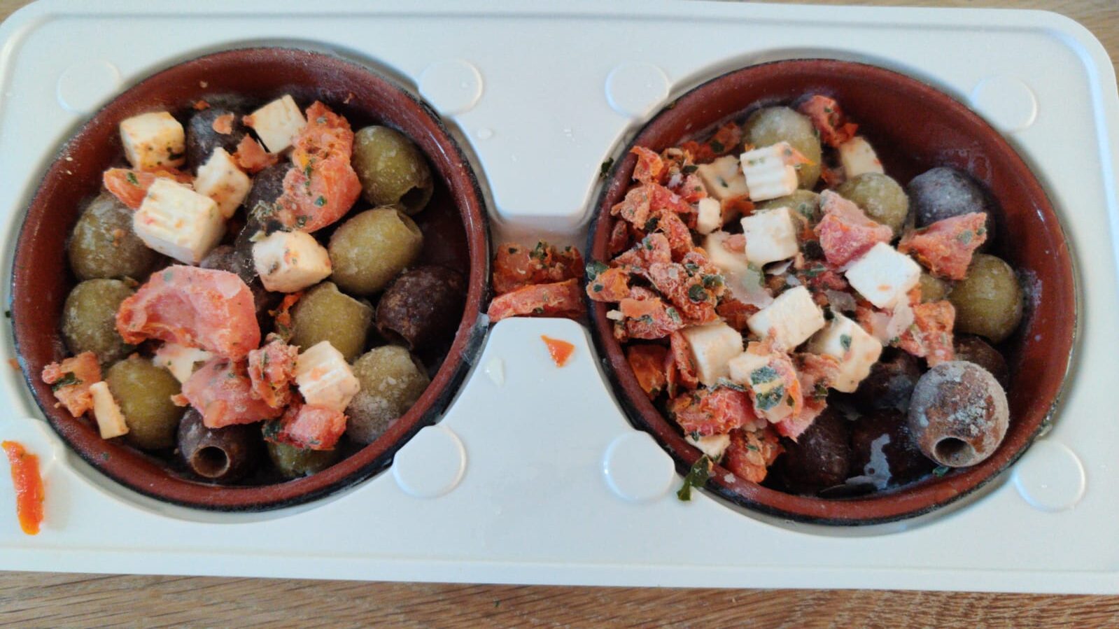 En dit was enorm muf. Olijven smaakten zuur en zonder structuur, de tomaatjes hadden zoveel met tomaten te maken als een pot witte saus met een croque en dan die gore aidskaas. Zelfs de goedkoopste nepfeta heeft meer structuur dan deze zompige kopkaas. Dit is wat er geoogst kan worden als Vindicat een weekend in de ardennen gaat survivallen zonder te douchen maar dan smaakt deze kaas nog steeds slechter. Denken we.