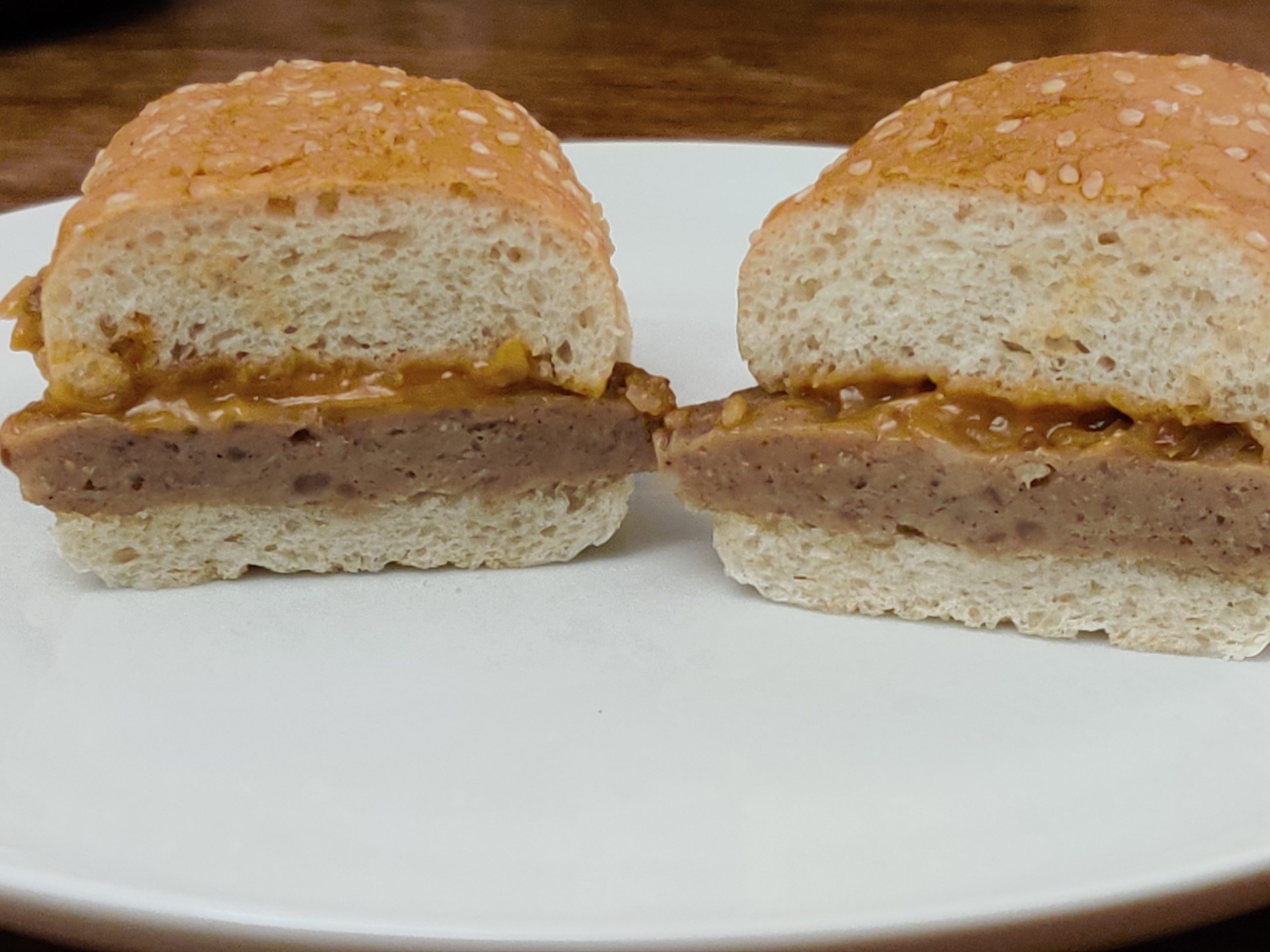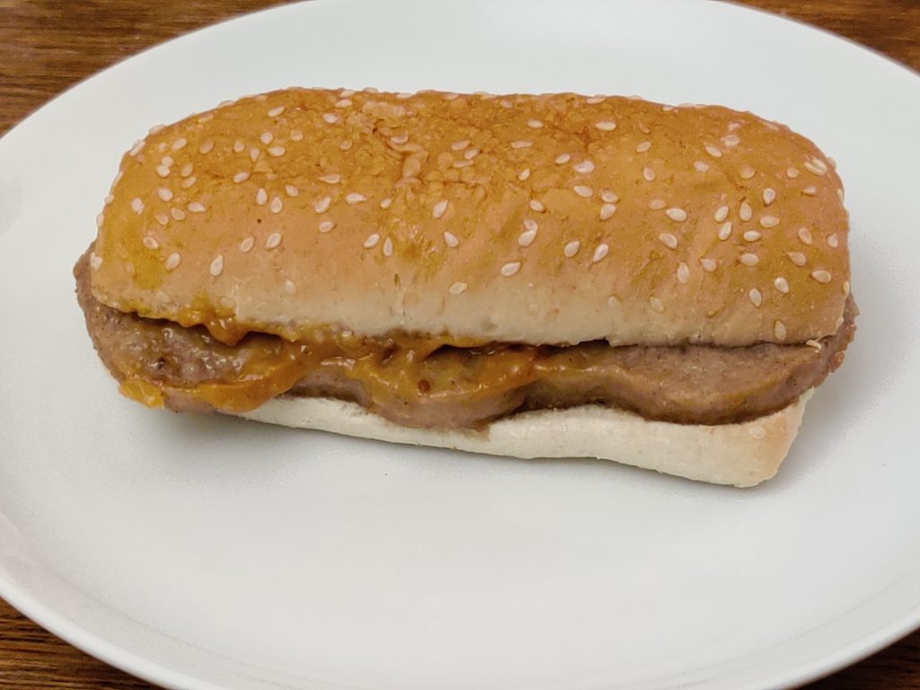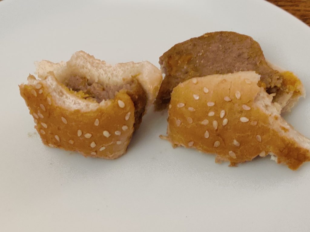 Mocht u nu langs de randjes een beetje bruine afscheiding zien dan klopt dat, deze bal gehakt blijkt een platgewalste frikandel Jos Brink te zijn.