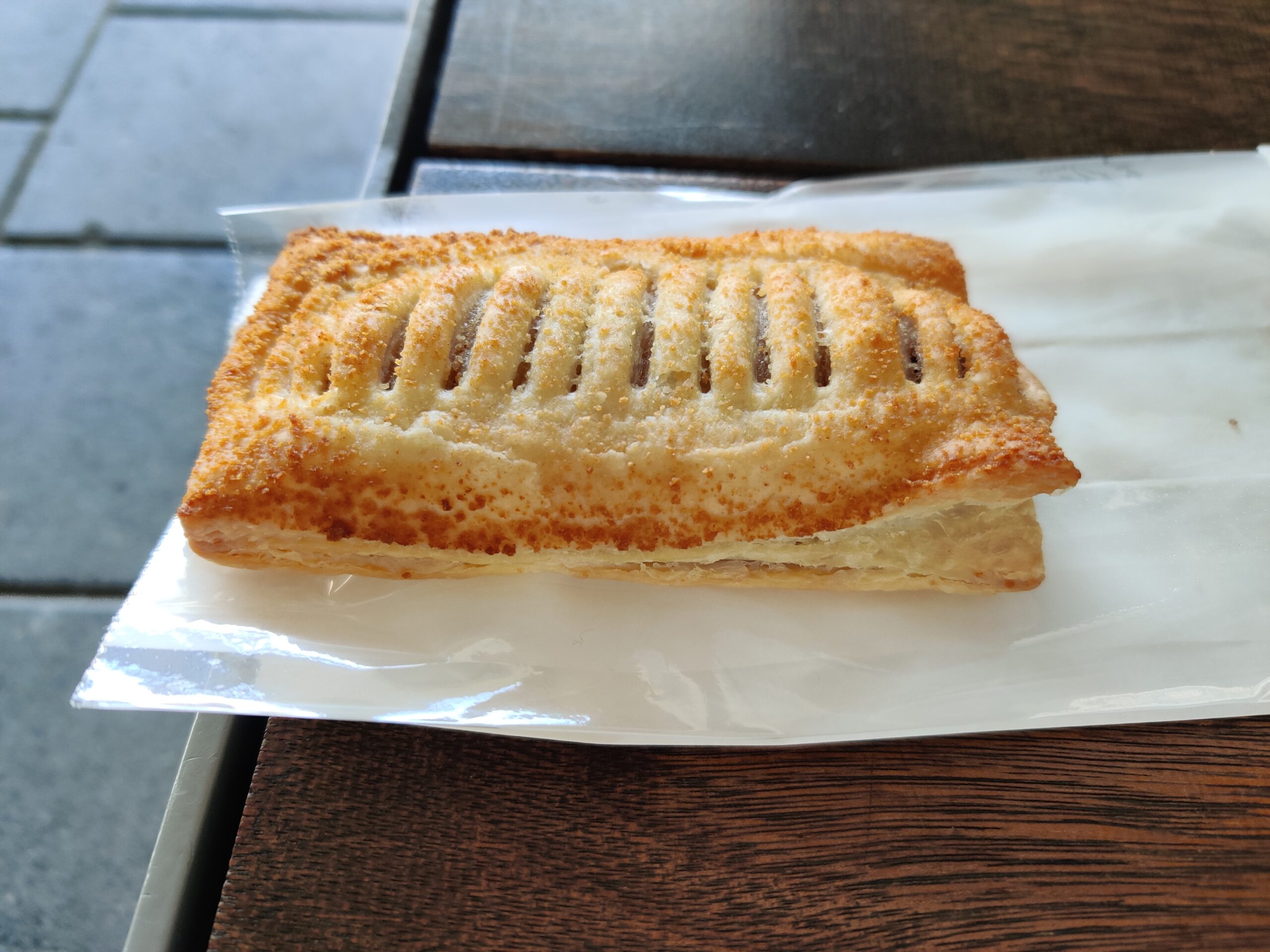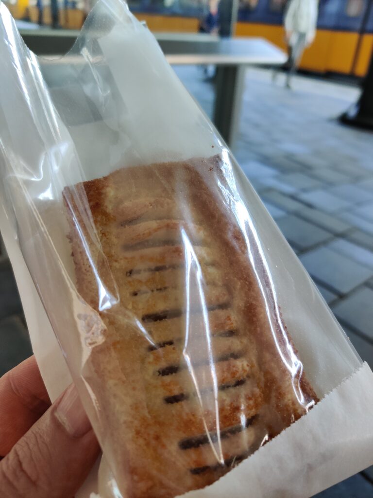 En zo bevonden we ons op een treinstation waar we tegen de onvermijdelijke vertraging aanliepen en dus bij gebrek aan ramenwinkeltje moedeloos de Kiosk binnenliepen. En waarop viel ons oog, het Vegan Satehbroodje. Het kostte slechts 1,50 euro dus met een warm broodje in de knuistjes op een bankje gaan zitten en de aanwinst eens van dichtbij bekeken.
