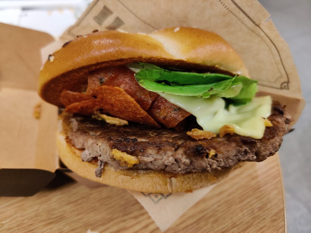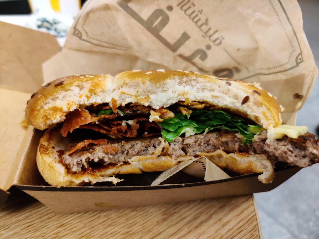 We zien de burger, dunnetjes en droog op zicht (waarbij halal niet helpt), wat kaas wat in ieder geval niet zo’n stukje plastic burgercheddar is want daar is genocide nog te mild voor, stukje sla naar de mensen toe en plakjes salami, of wat daarvoor door moet gaan. Het heeft nul big erin, die salami, wegens de lokale denkbeeldige ruimtepapa, en bij het lichtjes aanraken blijft de salami hard te zijn. Krokant bijna. Nou, wordt er verzucht, dat zal wel weer kut worden.