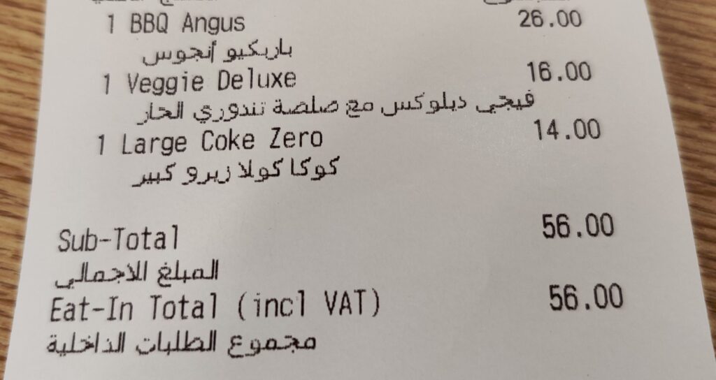 Alleen de Coke is juist geprijsd, 14 Emiratische roepi’s, het gehele bonnetje komt uit op geen 14 euro. Dan na enig wachten kwam er een volledige Bever Sport aan tenten voorbij en uiteindelijk de bestelling. Eerst de Veggie proberen.