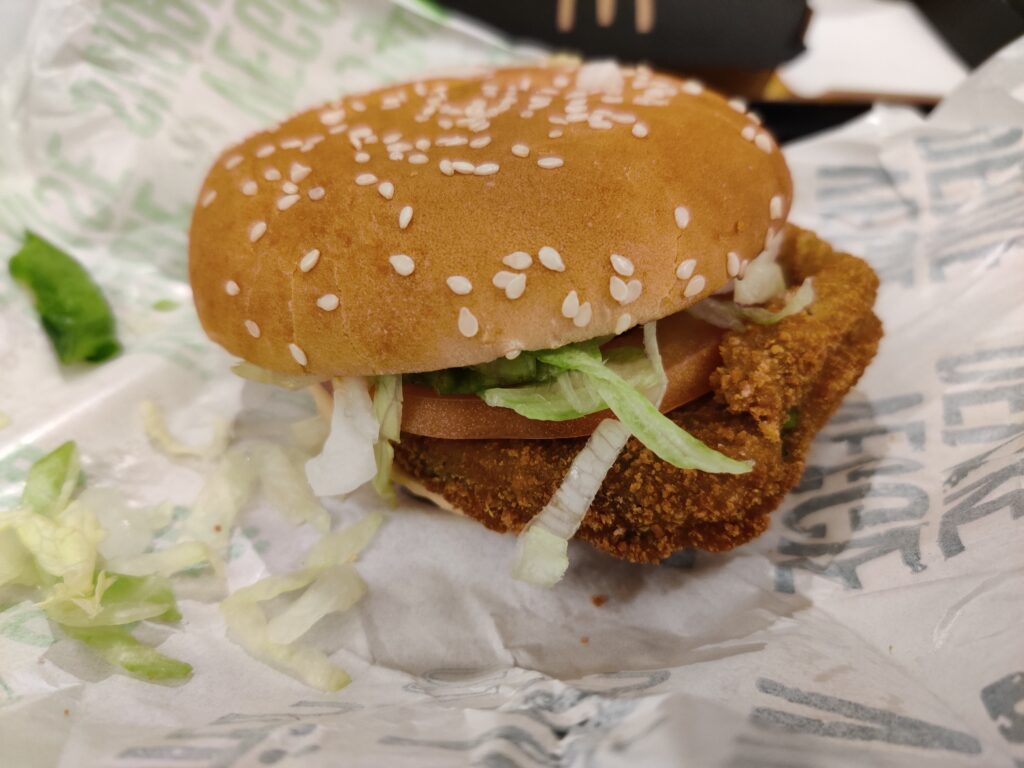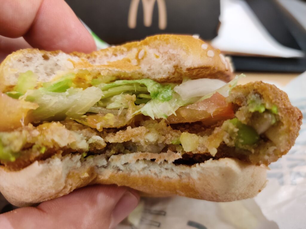 Vergeleken met de Angus is de burgert zowel in verpakking als formaat bescheiden. Plastic eraf en dan is het een soort slecht gevormde schijf met een lading sla, tomaat en ui.