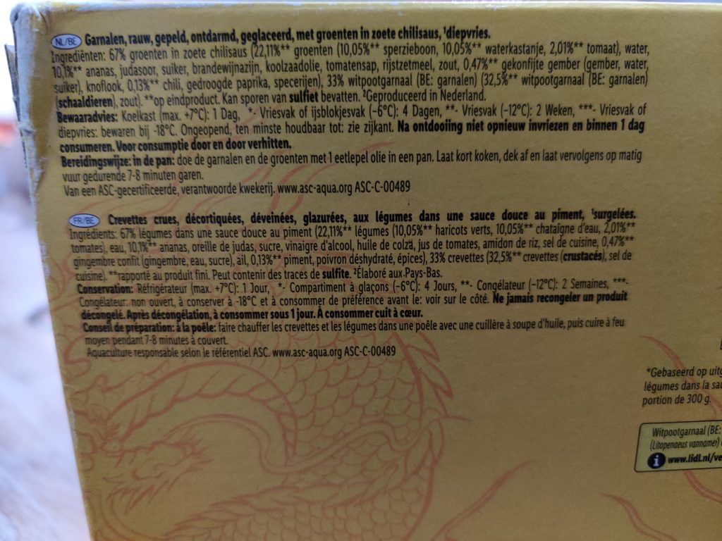 Dan terwijl de garnalen met de groentefantasie in de pan spartelen kijken we nog even naar de inhoud. Het is vooral suiker en zout, naast de garnalen.