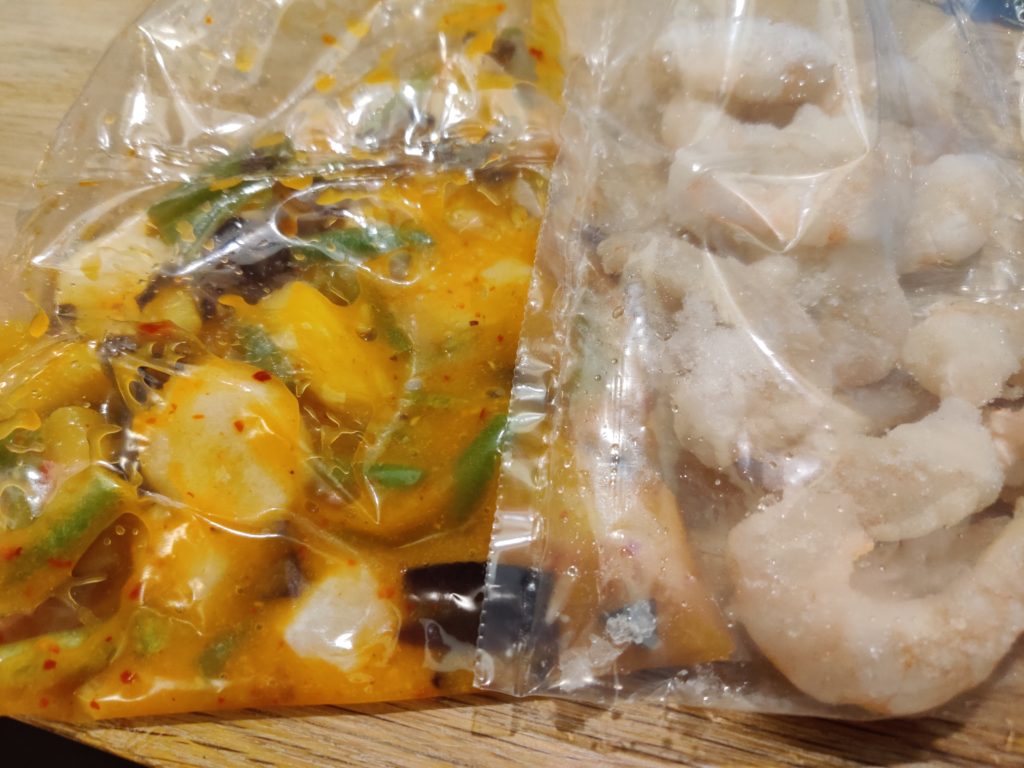 Een zak aangevroren garnalen en een zakje saus met brokjes groente. Hmmm, ziet er lekker uit zullen we maar zeggen.
