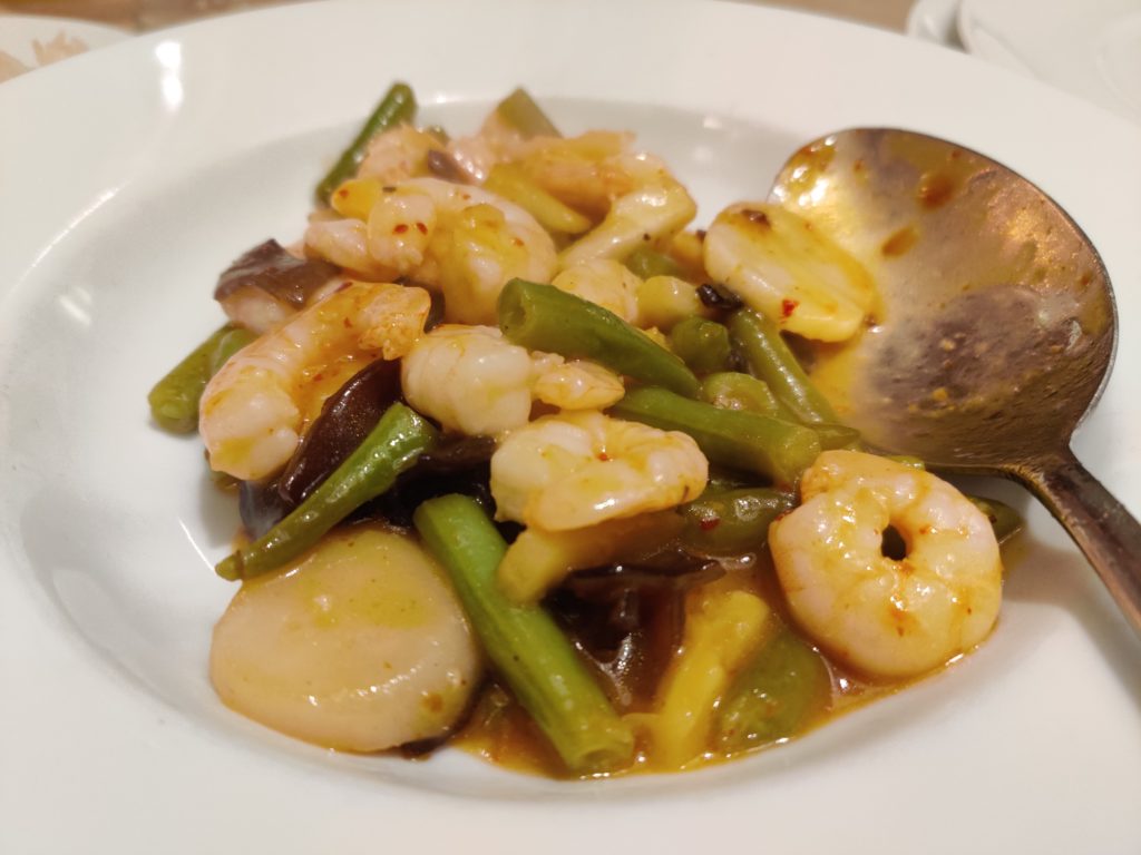 En dan het resultaat. De sperziebonen zijn middelmatig, de garnalen merkbaar goedkope rommel, de waterkastanje nog wel knisperig en judasoor geeft een fijne afwisseling. Maar is dit te vreten? Nee. De saus is zoet, overheersend en mist iedere nuance. Ook deze heeft na één hap per recensent de weg naar de uitgang gevonden.